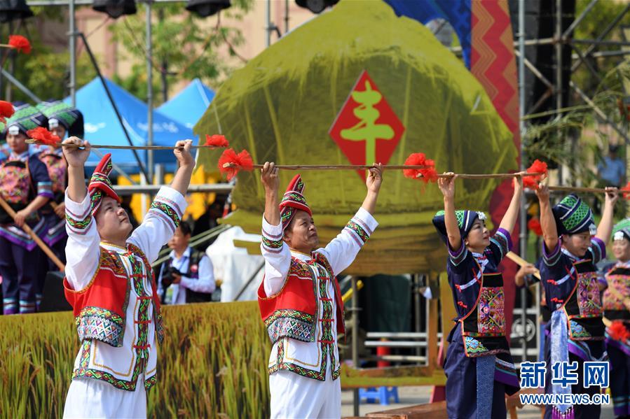 9月17日,广西都安瑶族自治县密洛陀文化公园广场,演员在启动仪式上表演壮族扁担舞。 当日,2019年广西庆祝“中国农民丰收节”启动仪式暨河池市“庆丰收·促脱贫”系列活动在都安瑶族自治县举行,各族群众和来宾一起载歌载舞欢庆丰收节。 新华社记者 陆波岸 摄