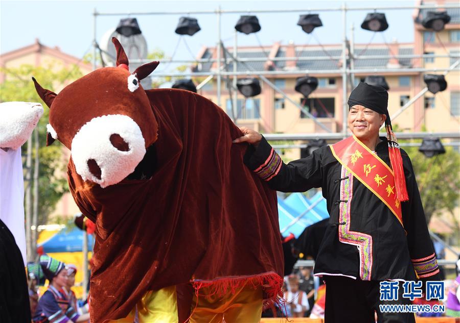 9月17日,广西都安瑶族自治县密洛陀文化公园广场,演员在启动仪式上表演节目。 当日,2019年广西庆祝“中国农民丰收节”启动仪式暨河池市“庆丰收·促脱贫”系列活动在都安瑶族自治县举行,各族群众和来宾一起载歌载舞欢庆丰收节。 新华社记者 陆波岸 摄