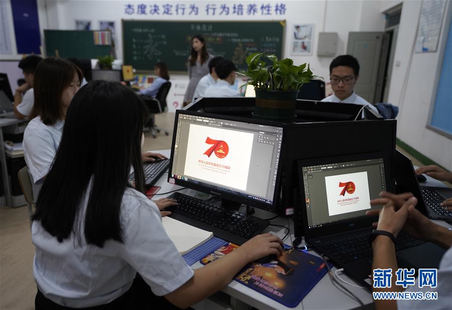 9月18日,邢台技师学院的学生在平面设计课程上临摹庆祝中华人民共和国成立70周年活动标识。 当日,河北省邢台技师学院开展“青春告白中国”活动,学生们通过唱歌、快闪、专业课程等形式,表达对祖国的热爱和祝福。 新华社记者 邢广利 摄