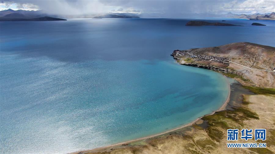 这是普姆雍错湖边的堆瓦村(9月19日无人机拍摄)。 普姆雍错位于西藏山南市浪卡子县境内,海拔五千多米,在周围雪山融水的滋润和阳光的照耀下,美若少女。 新华社记者 晋美多吉 摄