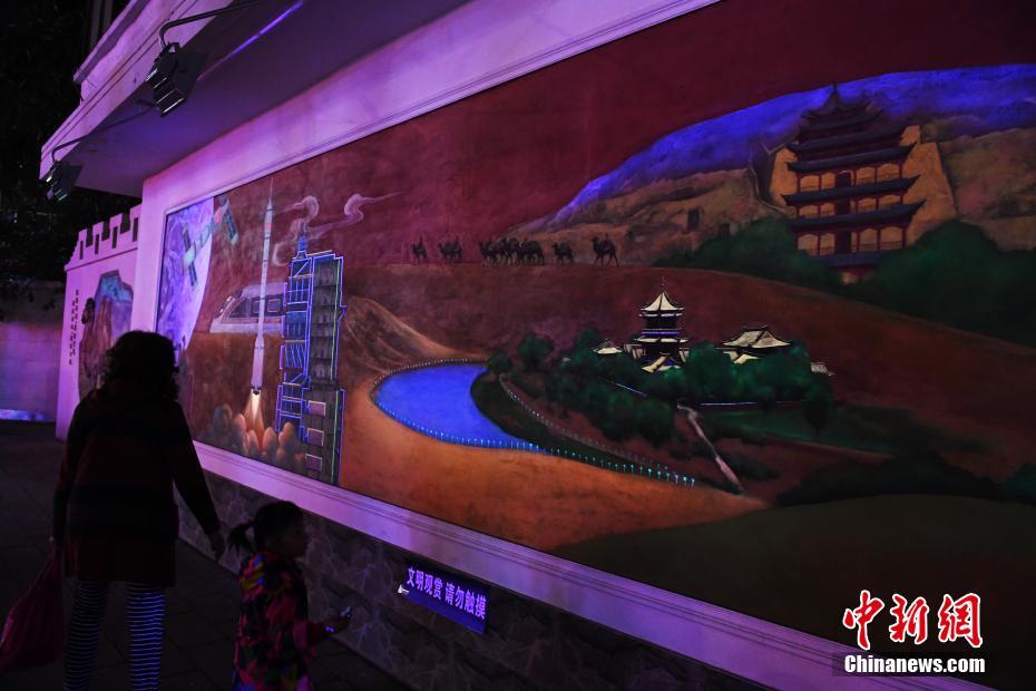 9月19日晚,以丝绸之路千年变迁发展为主题创作的荧光壁画亮相兰州街头吸引市民。荧光壁画内容包括敦煌莫高窟、中山桥、黄河水车、酒泉卫星发射基地、兰新高铁等。这组壁画长21.1米,高1.95米,可随着周围灯光变化在夜间展示不同色调,为兰州夜色添“亮”。中新社记者 杨艳敏 摄