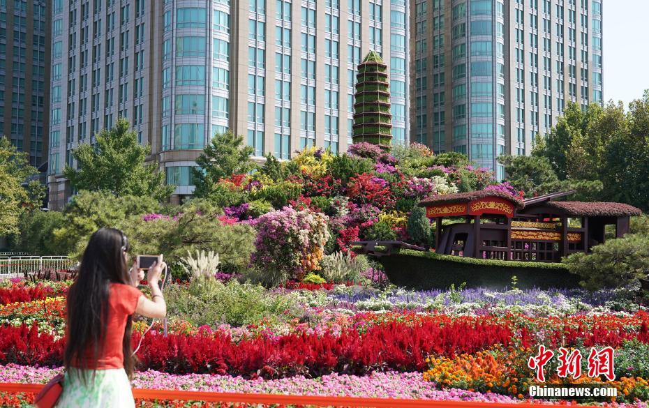 9月21日,市民在北京东单街头的“不忘初心”主题花坛前拍照。随着国庆节临近,北京街头主题花坛陆续亮相,吸引市民驻足观赏拍照。 中新社记者 张兴龙 摄