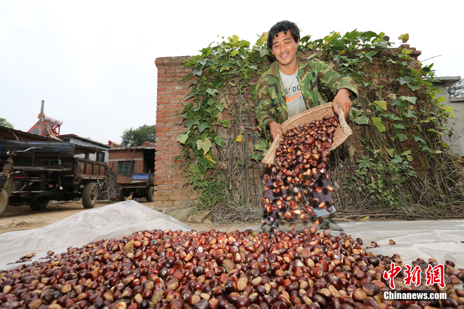 农民通过去皮机将板栗去除外皮。唐文业 摄