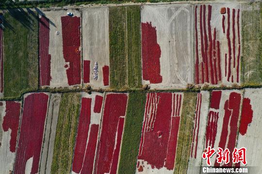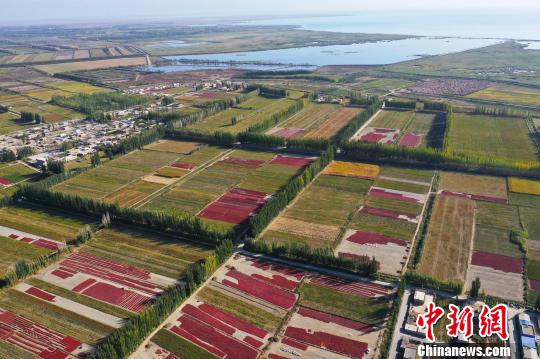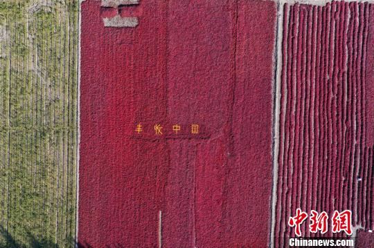 2019年9月23日,在新疆博湖县乌兰再格森乡席子木呼尔村晒场上,农牧民用丰收的辣椒、玉米等作物,摆出“丰收中国”字样, “晒”丰年,寄情喜悦欢庆丰收。 年磊 摄