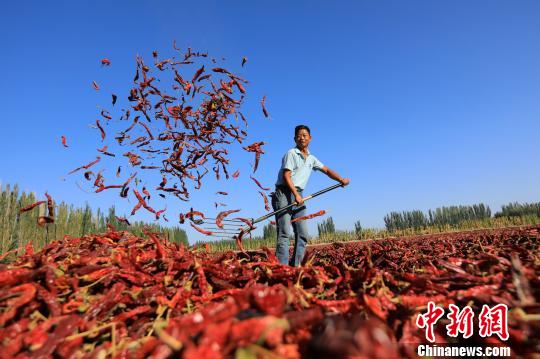 据了解,博湖县有着独特的地理气候,今年该县种植的11万亩辣椒,通过育苗移栽、节水滴灌、测土地施肥、综合防治病虫害等一系列新技术,辣椒喜获丰收,预计亩产450公斤以上(干辣椒)。博湖种植无公害、色泽好,红色素和辣椒碱的含量位居新疆所产辣椒前列,吸引了众多客商前来采购,其产品远销到日本、韩国、巴西等海外市场,种植辣椒已成为当地农民增收致富的“支柱产业”。