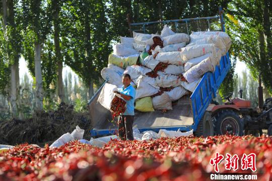 在新疆博湖县乌兰再格森乡席子木呼尔村晒场上,当地村民将采摘的辣椒运输到晒场上晾晒。 年磊 摄