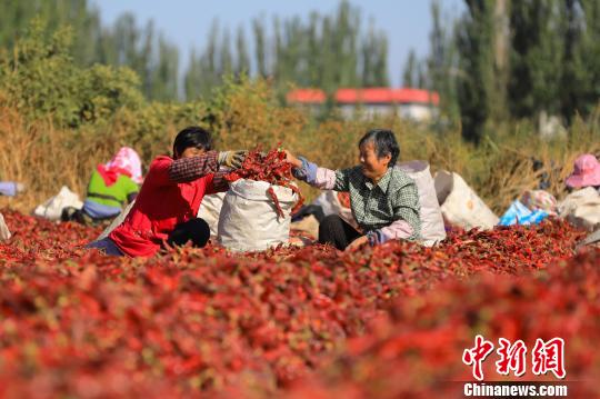 在新疆博湖县乌兰再格森乡席子木呼尔村晒场上,当地村民筛选晾晒的辣椒。 年磊 摄