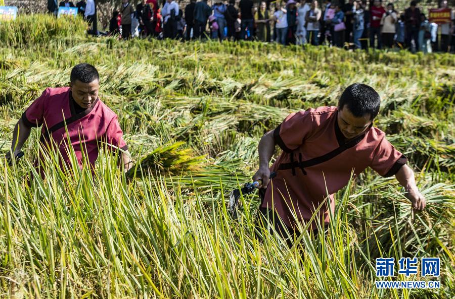 9月23日,湖北省秭归县九畹溪镇农民在运动会上参加割稻谷比赛。 金秋时节,各地一派丰收景象,农民们满怀收获的喜悦,迎接“中国农民丰收节”的到来。 新华社发(郑家裕 摄)