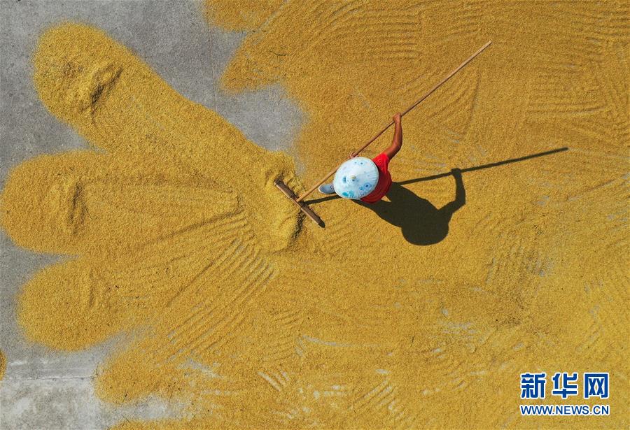 9月22日,贵州省铜仁市玉屏侗族自治县亚鱼乡郭家湾村村民在翻晒稻谷(无人机拍摄)。 金秋时节,各地一派丰收景象,农民们满怀收获的喜悦,迎接“中国农民丰收节”的到来。 新华社发(胡攀学 摄)