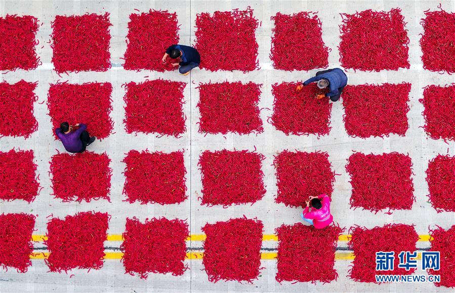 9月19日,农户在河北省邯郸市鸡泽县一家辣椒加工厂内晾晒辣椒(无人机拍摄)。