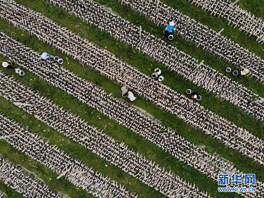 6月21日,村民在贵州省毕节市赫章县双坪乡新田村黑木耳种植基地采摘木耳(无人机拍摄)。 新华社发(韩贤普 摄)