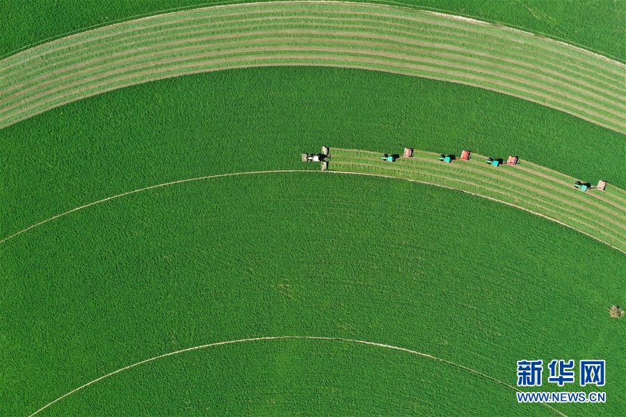 9月20日,在阿鲁科尔沁旗绍根镇,田园牧歌草业公司在组织机械收割苜蓿(无人机航拍)。 新华社记者刘磊 摄
