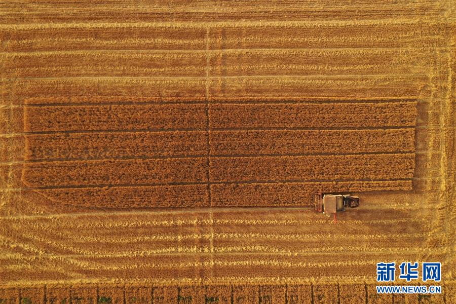 6月13日,雄安新区大王镇小王村村民在收获小麦(无人机拍摄)。 新华社记者 邢广利 摄