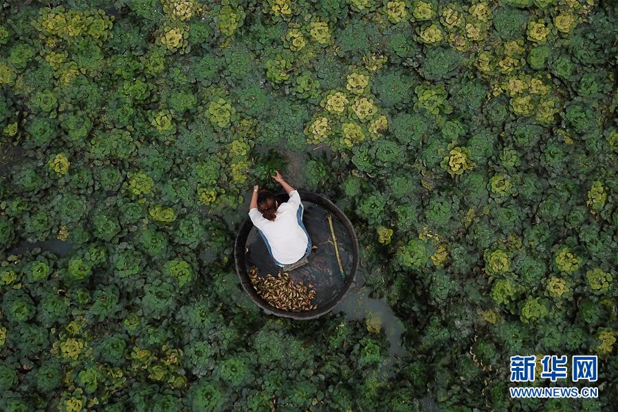 9月21日,在浙江省湖州市菱湖镇费家埭村菱塘,村民划着菱桶采摘菱角(无人机拍摄)。 新华社记者黄宗治摄