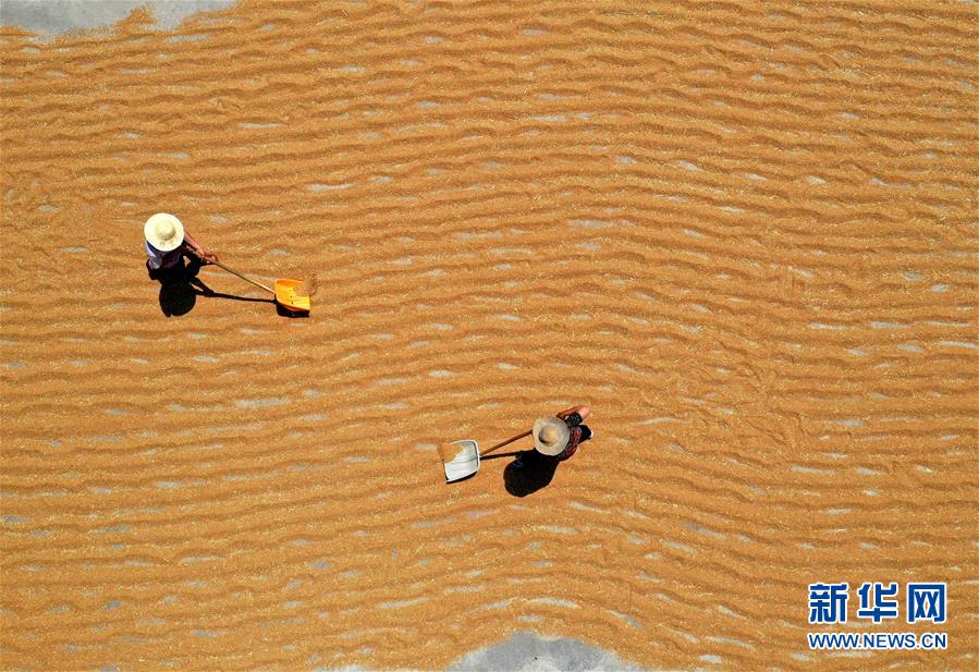6月13日,山西省运城市新绛县泽掌镇泽掌村村民在晾晒小麦(无人机拍摄)。 新华社发(高新生 摄)