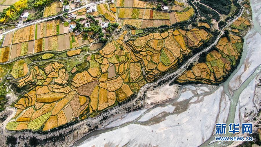 尼木玛曲河和两岸的错落有致的农田(9月13日无人机拍摄)。 新华社记者 晋美多吉 摄