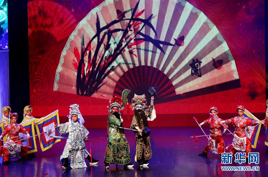 9月24日,安徽省合肥师范附小三小的学生在表演徽剧。 当日,“颂家乡美丽、赞祖国强大”长三角地区学校少年宫优秀文艺节目汇演在上海大宁剧院举行。 新华社记者 刘颖 摄