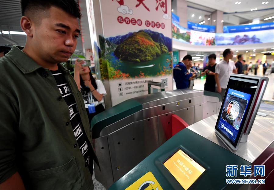 9月27日,工作人员在郑州地铁紫荆山站刷脸过闸。 当日,郑州地铁刷脸乘车支付系统正式上线,使用手机App注册并登录成功后,便可实现刷脸快速过闸,极大缩减乘客排队等待时间,为广大市民绿色出行提供了更加优质的智能化乘车体验。目前,郑州地铁1号线全线和14号线一期已开通刷脸乘车支付系统,每个站点的2个进站口和2个出站口设置有刷脸设备。 新华社记者 李嘉南 摄