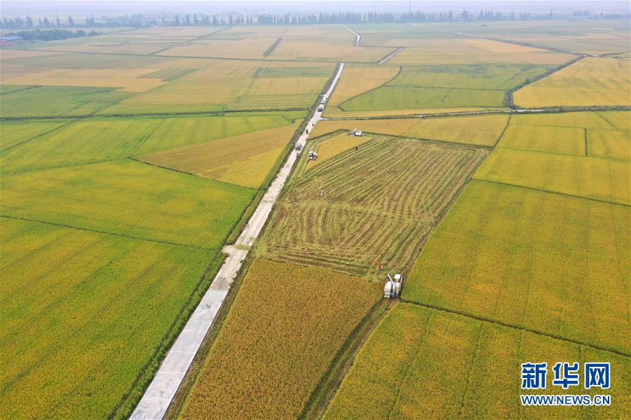 9月27日,在江西省南昌市南昌县南新乡谭口村,当地农户在收割成熟的晚稻(无人机拍摄)。 近日,赣抚平原灌区江西南昌县96.2万亩晚稻陆续开镰。该县通过开展水稻绿色高效生产技术培训,精准指导农户抓好田间管理,晚稻丰收在望。 新华社记者 彭昭之 摄