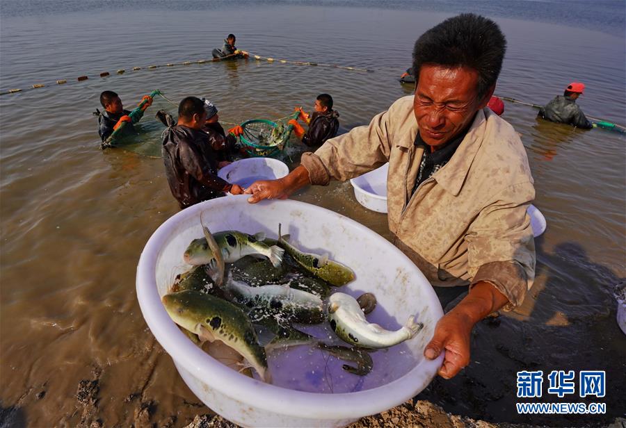 9月26日,唐山市曹妃甸区一家养殖场的工人在将捕捞的河豚运上岸。新华社记者 杨世尧 摄