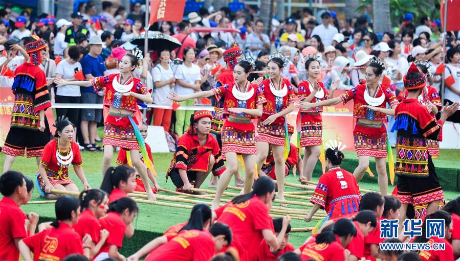 9月27日,在万人共跳竹竿舞海口主会场,演员表演竹竿舞。 当日,海南省万人共跳竹竿舞活动在海南省各地同时举行,10000余名竹竿舞表演者分布在19个会场,用主题鲜明、形式多样的竹竿舞表演喜迎国庆。 新华社记者 杨冠宇 摄