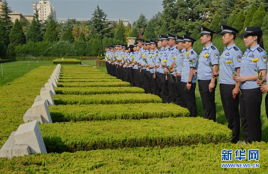 9月27日,河北出入境边防检查总站的民警向烈士墓碑献花。 烈士纪念日即将到来,河北出入境边防检查总站组织广大民警来到华北军区烈士陵园,通过献花、重温入党誓词、瞻仰烈士雕像和烈士墓碑等形式,重温革命历史,缅怀革命先烈。 新华社记者杨世尧摄