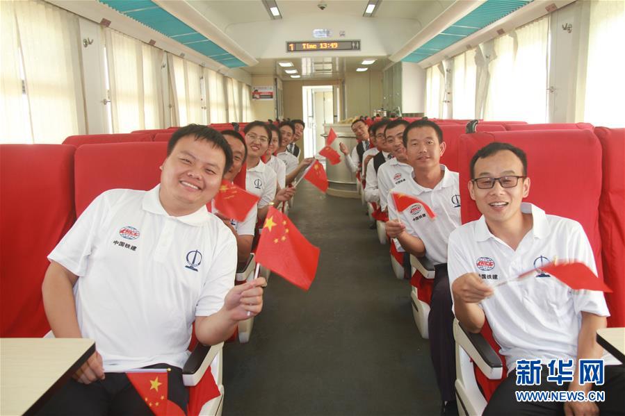9月27日,在尼日利亚首都阿布贾伊都火车站,承担铁路运营工作的中土集团尼日利亚有限公司青年员工在列车上与国旗合影。 新华社记者郭骏摄