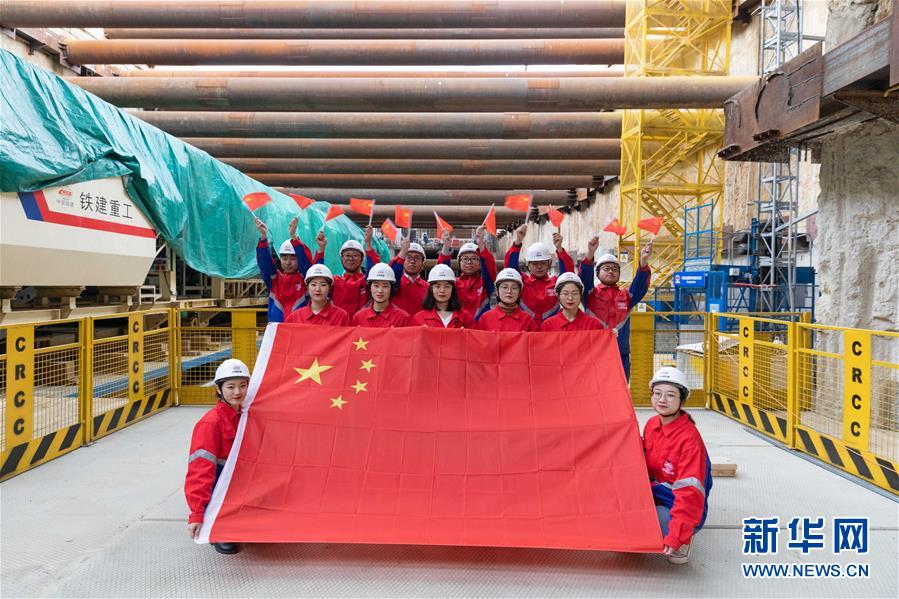9月28日,在俄罗斯首都莫斯科,参与莫斯科地铁项目修建的中国铁建股份有限公司(中国铁建)青年员工在施工现场与国旗合影。 新华社记者白雪骐摄