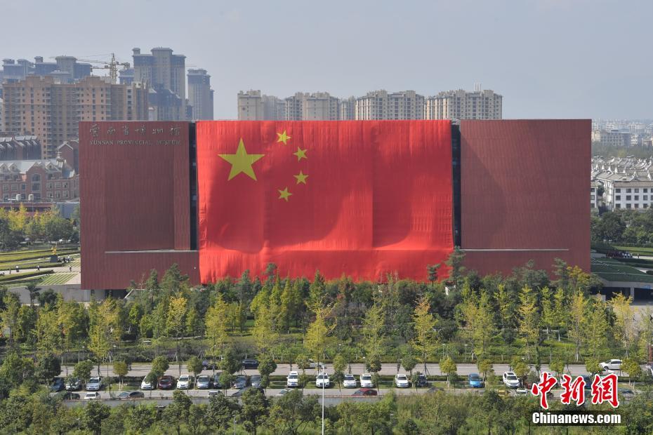 9月29日,昆明,悬挂在云南省博物馆外的国旗。国庆节到来之际,一面长52米、宽34.67米,总面积达1802.84平方米的国旗日前亮相云南省博物馆,几乎覆盖了一整面外墙,吸引众多市民到此合影。中新社记者 刘冉阳 摄