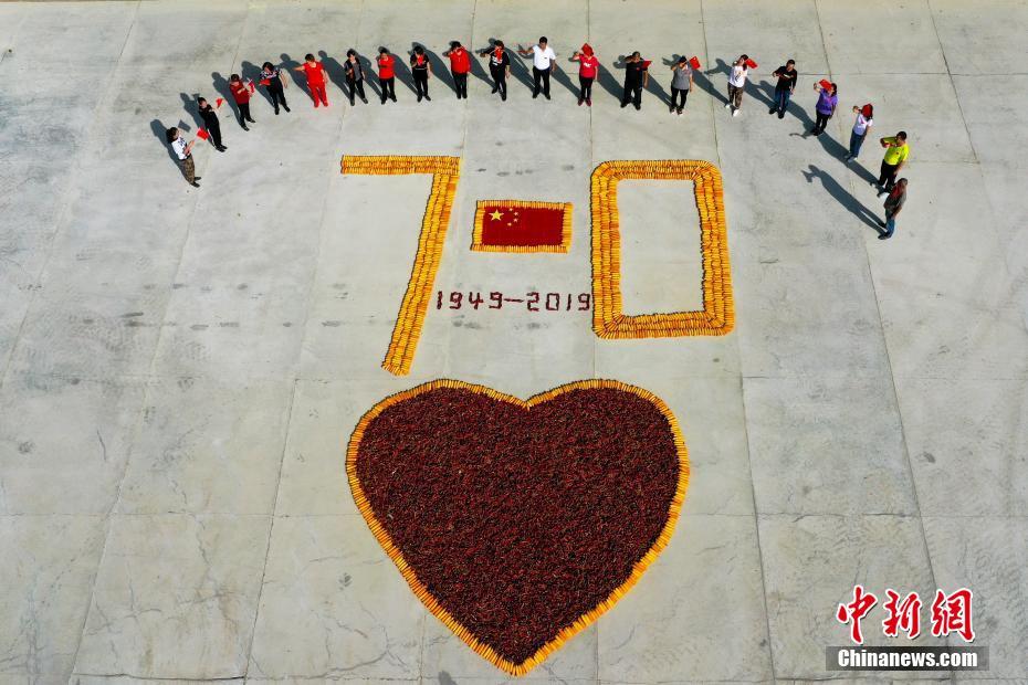 为庆祝新中国成立70周年,新疆各地举办了丰富多彩、形式多样的文化活动,祝福祖国繁荣富强。9月29日,在新疆博湖县查干诺尔乡敦都布呼村晾晒场上,当地农牧民群众用丰收的玉米、辣椒拼绘巨型图案,以农家特有的方式庆祝新中国成立70周年。文/图 年磊 王重阳