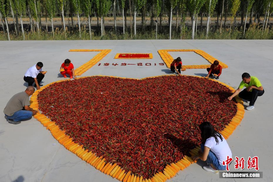 为庆祝新中国成立70周年,新疆各地举办了丰富多彩、形式多样的文化活动,祝福祖国繁荣富强。9月29日,在新疆博湖县查干诺尔乡敦都布呼村晾晒场上,当地农牧民群众用丰收的玉米、辣椒拼绘巨型图案,以农家特有的方式庆祝新中国成立70周年。文/图 年磊 王重阳