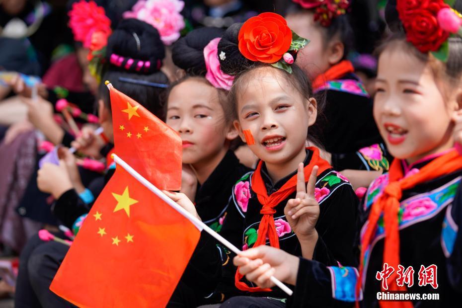 9月30日,贵州省黔东南苗族侗族自治州雷山县西江千户苗寨举行快闪活动,当地民众身着苗族盛装,与游客共同唱响《歌唱祖国》、《我爱你中国》、《我和我的祖国》等歌曲,迎接国庆。中新社记者 贺俊怡 摄