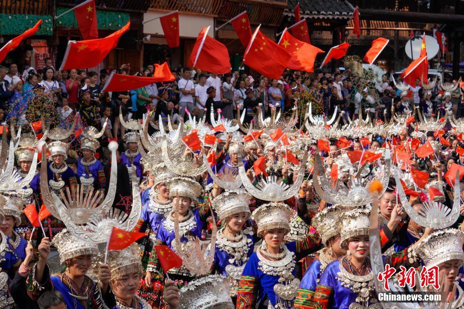 9月30日,贵州省黔东南苗族侗族自治州雷山县西江千户苗寨举行快闪活动,当地民众身着苗族盛装,与游客共同唱响《歌唱祖国》、《我爱你中国》、《我和我的祖国》等歌曲,迎接国庆。中新社记者 贺俊怡 摄