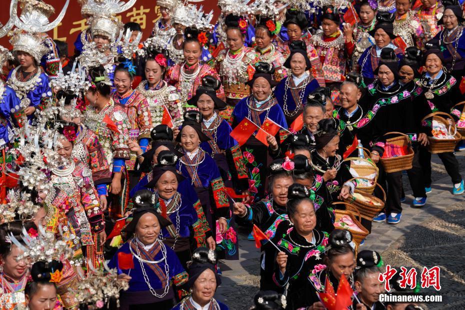 9月30日,贵州省黔东南苗族侗族自治州雷山县西江千户苗寨举行快闪活动,当地民众身着苗族盛装,与游客共同唱响《歌唱祖国》、《我爱你中国》、《我和我的祖国》等歌曲,迎接国庆。中新社记者 贺俊怡 摄