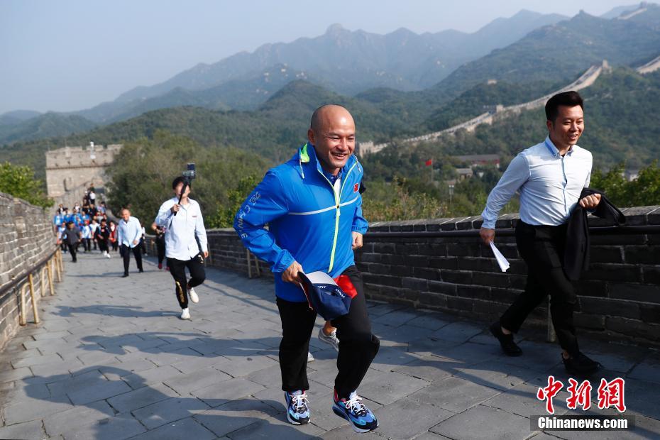 9月30日,香港警队代表来到北京八达岭长城参观游览。近日,10位受邀参加国庆70周年庆祝活动的香港警队代表抵达北京。图为香港警务处机动部队警署警长、被称为“光头警长刘Sir”的刘泽基登八达岭长城。中新社记者 富田 摄