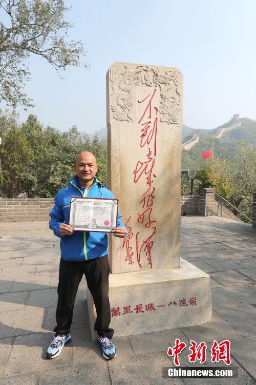 9月30日,香港警队代表来到北京八达岭长城参观游览。近日,10位受邀参加国庆70周年庆祝活动的香港警队代表抵达北京。图为香港警务处机动部队警署警长、被称为“光头警长刘Sir”的刘泽基登上八达岭长城并获得登城证书。中新社记者 张宇 摄