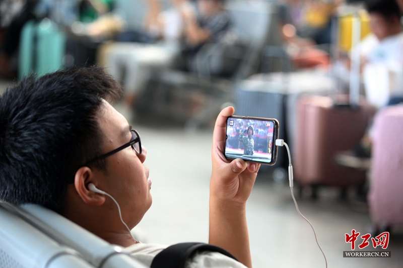 南昌火车站广场:旅客挥舞国旗观看国庆阅兵电视直播