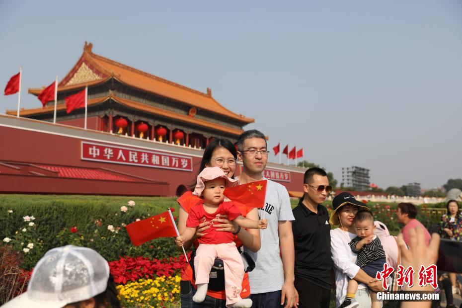 10月2日,国庆假期第二天,天安门成为旅游热门景点。图为一家三口在天安门前合影留念。中新社记者 蒋启明 摄