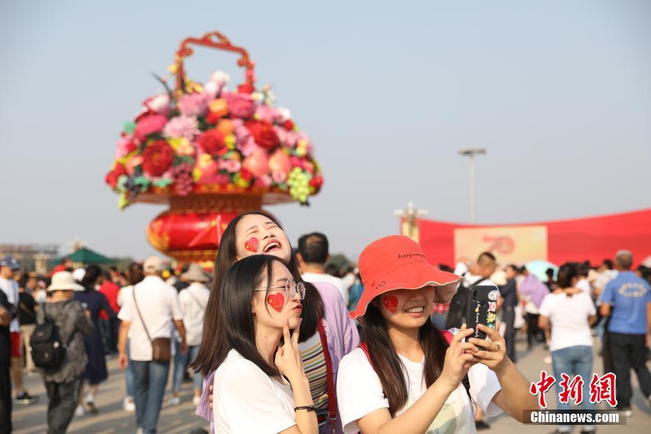 10月2日,以“普天同庆”为主题的中心花坛亮相天安门广场。花坛以花果篮为主造型,花坛顶高18米,篮体高16米,篮盘直径12米,花坛底部直径45米。图为游客在花坛前自拍。中新社记者 蒋启明 摄