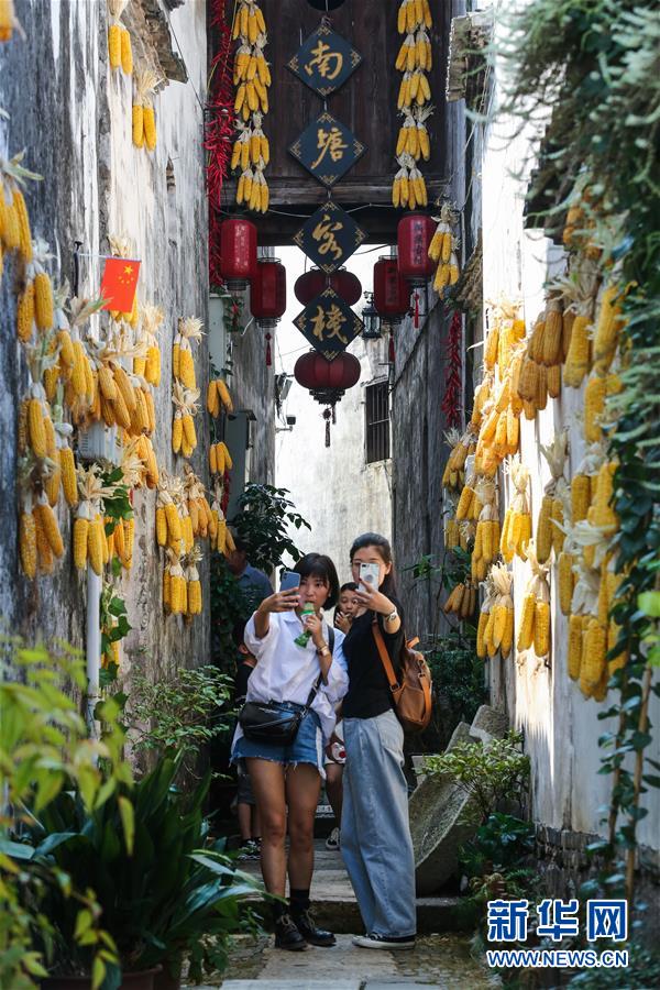 10月5日,游客在新叶古村的巷子内,拍摄“晒秋”美景。 新华社记者 徐昱 摄