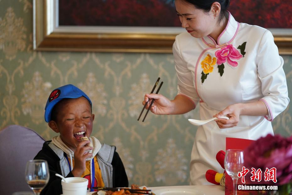 10月10日,一名西藏先心病患儿品尝烤鸭。当日,26名西藏先心病患儿来到全聚德烤鸭北京和平门店参观,并品尝烤鸭。今年8月,中国红十字基金会联合北京安贞医院在西藏那曲地区开展贫困先心病患儿筛查救助活动,共计筛查300余名儿童,符合手术指征的患儿共31名。此次行动由爱心企业捐赠145.7万余元人民币(下同),中国红基会配套支持54.3万余元,共计200万元。11日开始,本批患儿将陆续接受手术治疗。中新社记者 苏丹 摄
