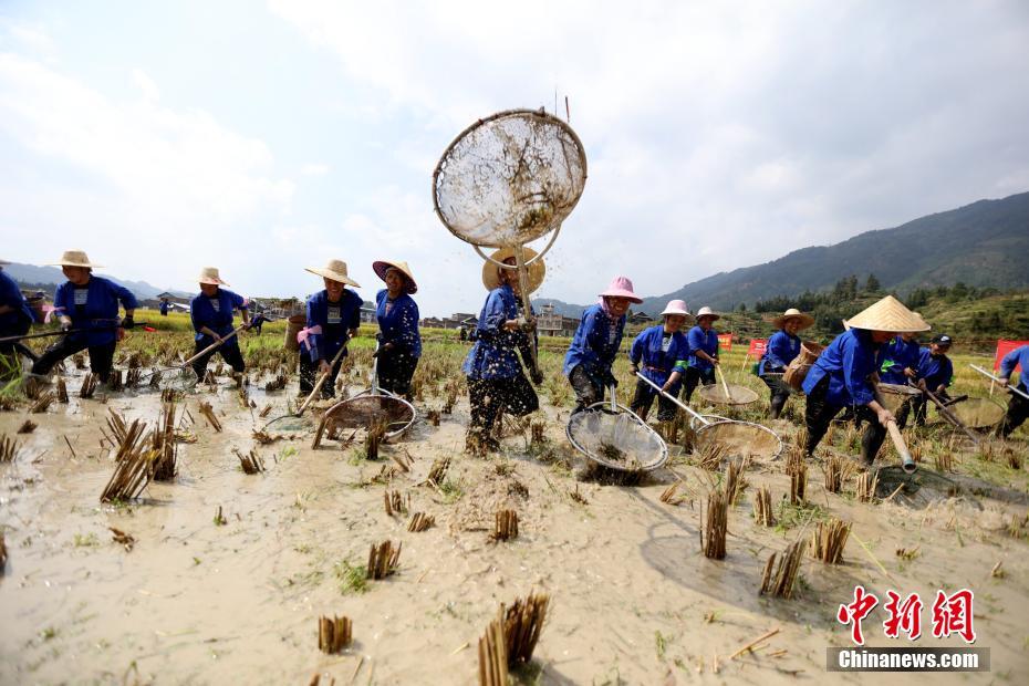 广西百余名侗族妇女赛抓鱼打谷庆祝丰收