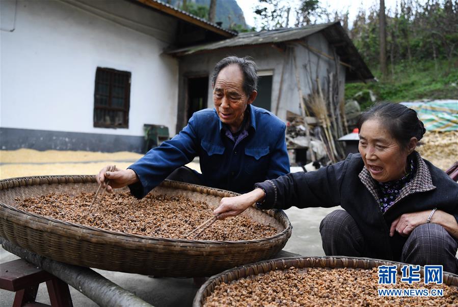10月12日,在陕西省岚皋县蔺河镇蒋家关村,刘照元和老伴毕明兰在屋前土法制作豆瓣酱。 新华社记者陶明摄