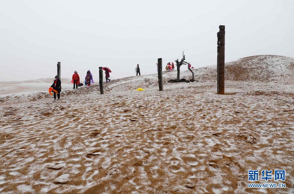 10月15日,游客在宁夏中卫市沙坡头景区欣赏沙漠雪景。新华网 杜文杰 摄