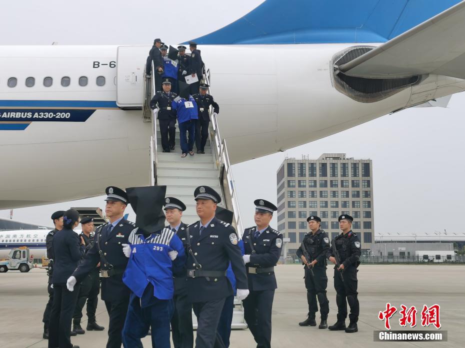 图为10月15日,河南公安机关将136名电信网络诈骗犯罪嫌疑人从老挝押解回国。 刘鹏 摄