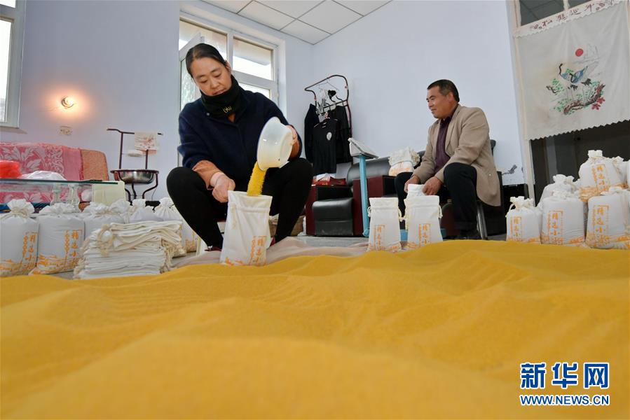 在夺火乡高谷堆村,村民在打包加工好的小米(10月14日摄)。