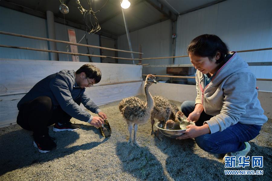 村民许俊鹏和妻子在照料小鸵鸟(10月14日摄)。2017年初,高谷堆村贫困户许俊鹏一家在扶贫干部的帮助下开始尝试养殖鸵鸟创收。目前,许俊鹏一家已建成拥有20余只鸵鸟的养殖基地,平均年收入近4万元。 新华社记者 曹阳 摄