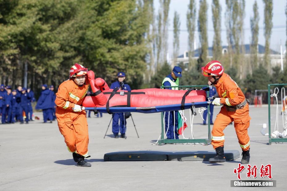 10月16日,哈尔滨市消防救援支队2019年度岗位练兵比武竞赛在哈尔滨举行。图为百米障碍救助操竞赛现场。中新社记者 吕品 摄