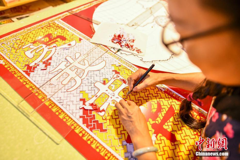 10月16日,黄海桃制作剪纸艺术画《爱我中华》。据了解,在海口市秀峰实验学校担任美术老师的黄海桃与画友历时三年潜心设计、绘画、剪裁,完成了刻画中华五十六个民族的剪纸画。单幅作品画幅为73厘米×48厘米,每幅作品都融入了相对应民族的服饰与背景元素,展现了浓浓的民族风情。中新社记者 骆云飞 摄