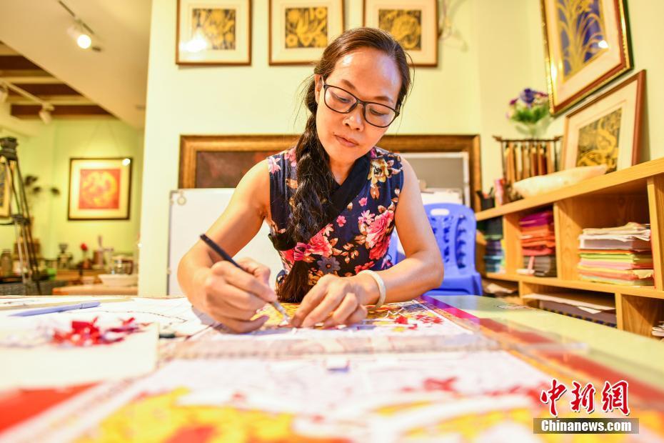 10月16日,黄海桃制作剪纸艺术画。据了解,在海口市秀峰实验学校担任美术老师的黄海桃与画友历时三年潜心设计、绘画、剪裁,完成了刻画中华五十六个民族的剪纸画。单幅作品画幅为73厘米×48厘米,每幅作品都融入了相对应民族的服饰与背景元素,展现了浓浓的民族风情。中新社记者 骆云飞 摄